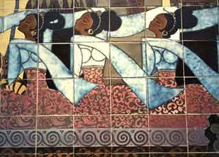 六七十年代后隨著公共建筑的大量興建,陶壁創(chuàng)作日益興盛起來,如日本當(dāng)代著名陶藝家會田雄亮做過許多的陶藝型壁畫《如圖5-8》,它的作品結(jié)合環(huán)境、燈光,極具現(xiàn)代感而顯得異常美麗,這種與建筑相融合的藝術(shù)表現(xiàn)形式,陶壁不僅僅作為護壁之用,而更多的是從建筑空間及公共環(huán)境的藝術(shù)觀念和美化裝飾考慮。