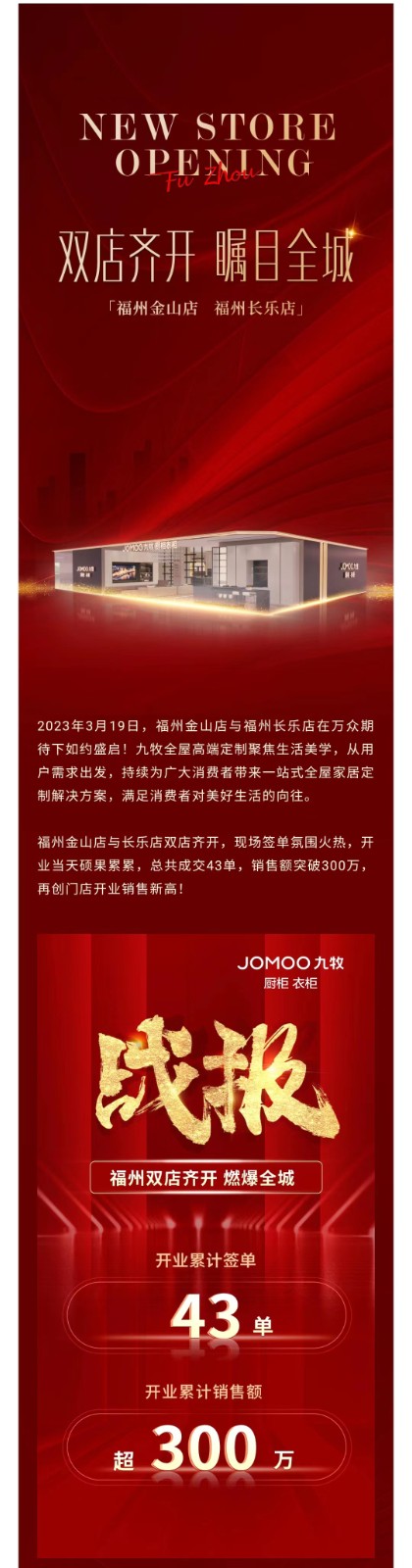 2023年3月19日,福州金山店與福州長(zhǎng)樂(lè)店在萬(wàn)眾期待下如約盛啟!九牧全屋高端定制聚焦生活美學(xué),從用戶需求出發(fā),持續(xù)為廣大消費(fèi)者帶來(lái)一站式全屋家居定制解決方案,滿足消費(fèi)者對(duì)美好生活的向往。
