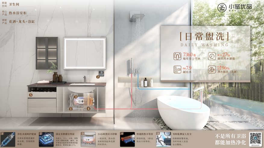 以衛(wèi)浴空間為例,小圣優(yōu)品衛(wèi)浴以熱水浴室柜、熱水花灑、熱凈龍頭核心三劍客為標(biāo)志產(chǎn)品,并開發(fā)推出花灑、龍頭、浴室柜、智能馬桶、五金配件等全衛(wèi)產(chǎn)品,以整體熱水空間解決方案,滿足了年輕消費(fèi)者對健康、智能家庭用水生態(tài)系統(tǒng)與高品質(zhì)生活的雙重需求。