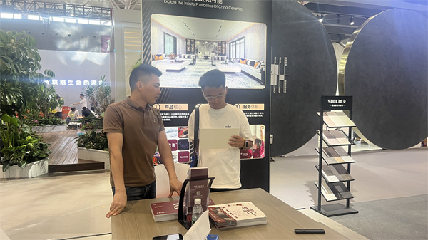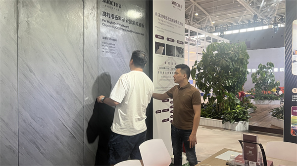 本次展會,索瓷的展位以簡約統(tǒng)一的設(shè)計風(fēng)格,“晨光魚肚白”的背景墻和“云墨灰”的墻面組合,充分呈現(xiàn)出集成巖板的材料美學(xué)和創(chuàng)新技術(shù),吸引了眾多協(xié)會領(lǐng)導(dǎo)、設(shè)計師和客商前來參觀和指導(dǎo)交流。