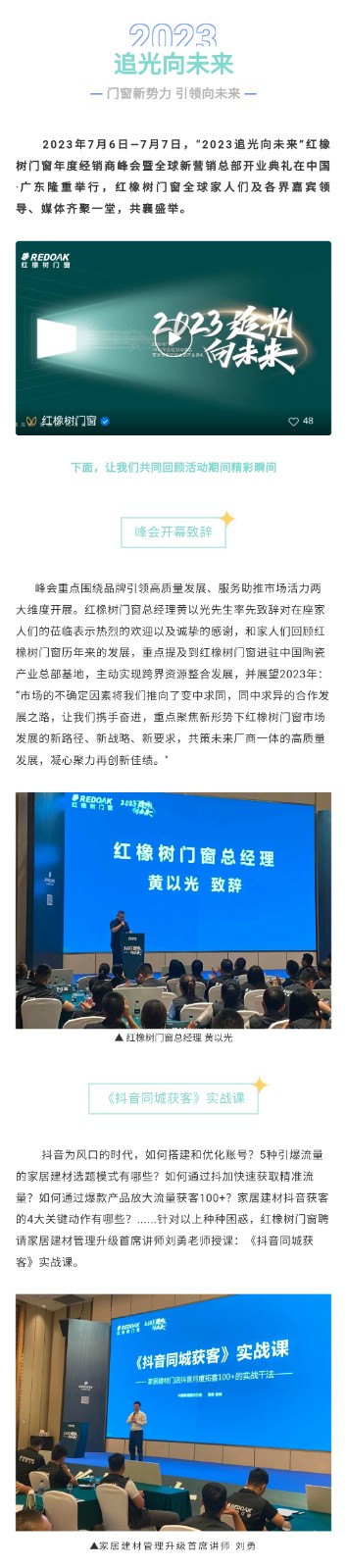 2023年7月6日—7月7日,“2023追光向未來(lái)”紅橡樹門窗年度經(jīng)銷商峰會(huì)暨全球新營(yíng)銷總部開業(yè)典禮在中國(guó)·廣東隆重舉行,紅橡樹門窗全球家人們及各界嘉賓領(lǐng)導(dǎo)、媒體齊聚一堂,共襄盛舉。
