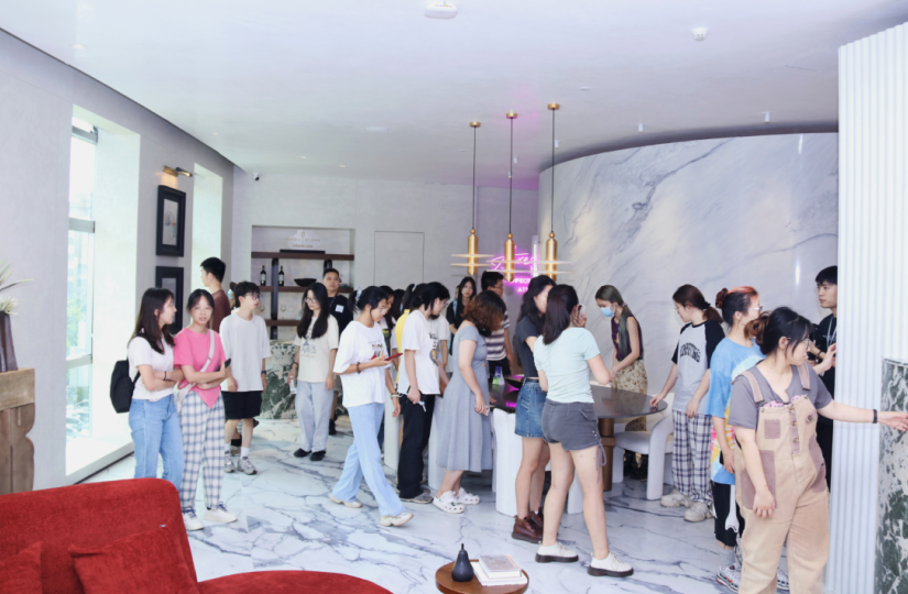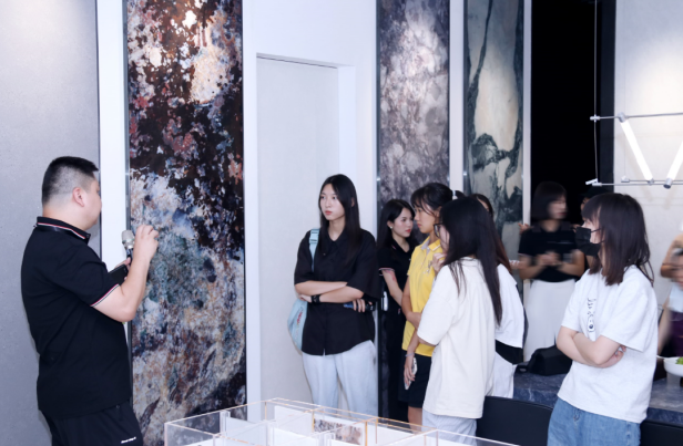 在歐若拉精工奢石高定館的參觀環(huán)節(jié)中,多位產(chǎn)品技術(shù)人員向廣美研學(xué)團(tuán)一行進(jìn)行了細(xì)致講解,向同學(xué)們?cè)敿?xì)闡述了歐若拉精工奢石產(chǎn)品的創(chuàng)意設(shè)計(jì)、環(huán)保理念以及特色應(yīng)用,大家也被品牌的獨(dú)特設(shè)計(jì)和獨(dú)特質(zhì)感所吸引。同學(xué)們通過親自體驗(yàn)和實(shí)際操作,感受到了創(chuàng)新設(shè)計(jì)所帶來的無限可能性,領(lǐng)略精工奢石產(chǎn)品與設(shè)計(jì)融合所創(chuàng)造的獨(dú)特魅力。