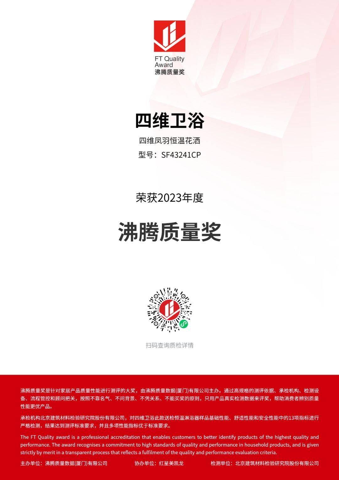 在2023沸騰質(zhì)量獎測評中,四維衛(wèi)浴參評的四維鳳羽恒溫花灑SF43241CP,經(jīng)過承檢機構(gòu)北京建筑材料檢驗研究院股份有限公司,對四維衛(wèi)浴此款送檢恒溫淋浴器樣品基礎(chǔ)性能、舒適性能和安全性能中的13項指標進行嚴格檢測,結(jié)果達到測評標準要求,并且多項性能指標優(yōu)于標準要求,獲得“沸騰質(zhì)量獎”。