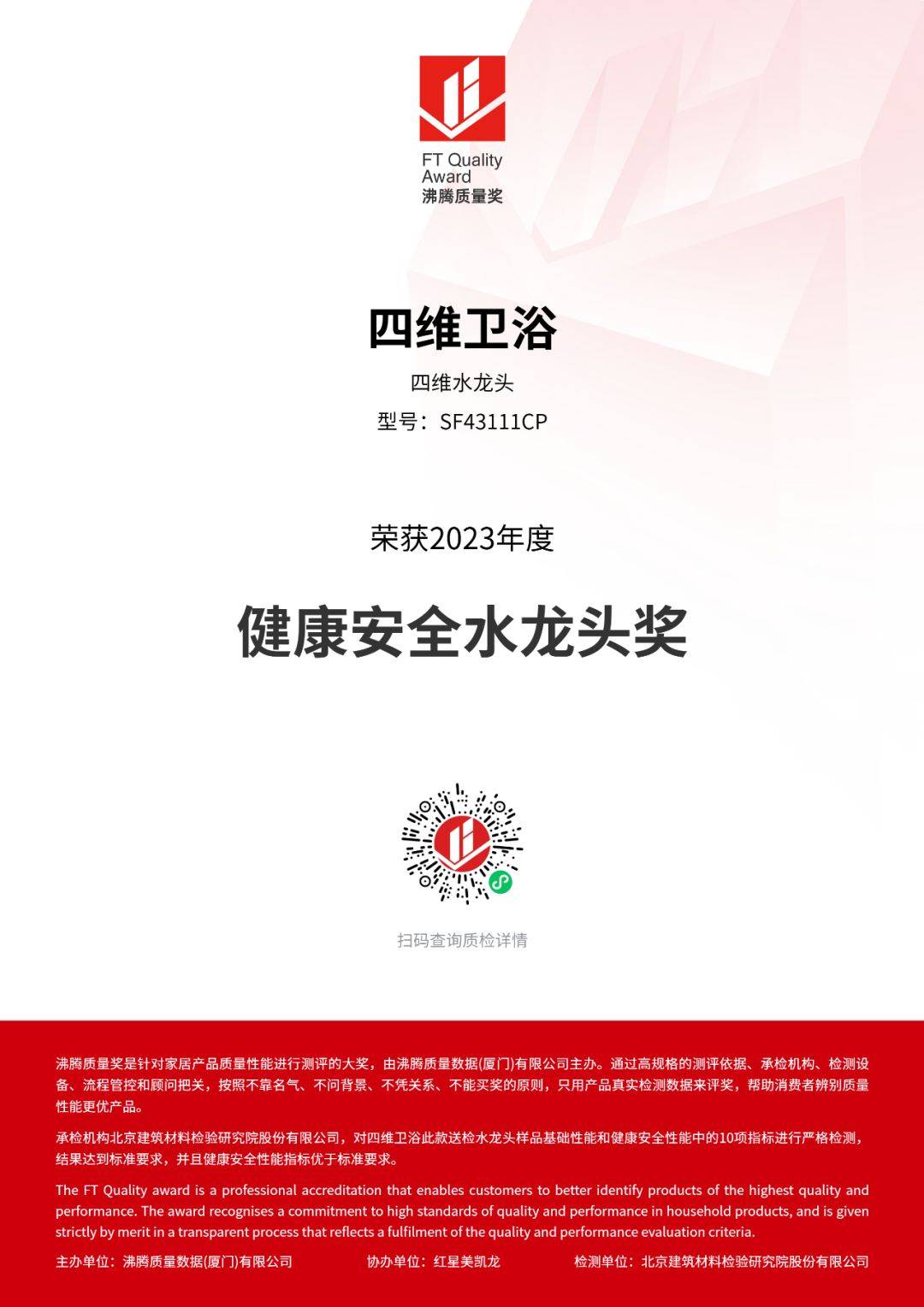 四維衛(wèi)浴參評的五金龍頭SF43111CP,經(jīng)過承檢機構(gòu)北京建筑材料檢驗研究院股份有限公司,對四維衛(wèi)浴此款送檢水龍頭樣品基礎(chǔ)性能和健康安全性能中的10項指標進行嚴格檢測,結(jié)果達到標準要求,并且健康安全性能指標優(yōu)于標準要求,獲得“健康安全水龍頭獎”。