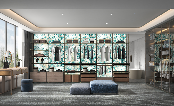 衣帽間采用透光奢石設(shè)計(jì),厚重與清透的感受相互融合,隱藏式燈帶與綠色奢石形成和諧互補(bǔ)。衛(wèi)生間色調(diào)搭配簡(jiǎn)約優(yōu)雅,精工奢石材質(zhì)為室內(nèi)增添了溫暖和深度,干濕分離則營(yíng)造出一種層次分明的感受,這些元素以一種靈動(dòng)而舒適的方式將空間連接起來(lái)。
