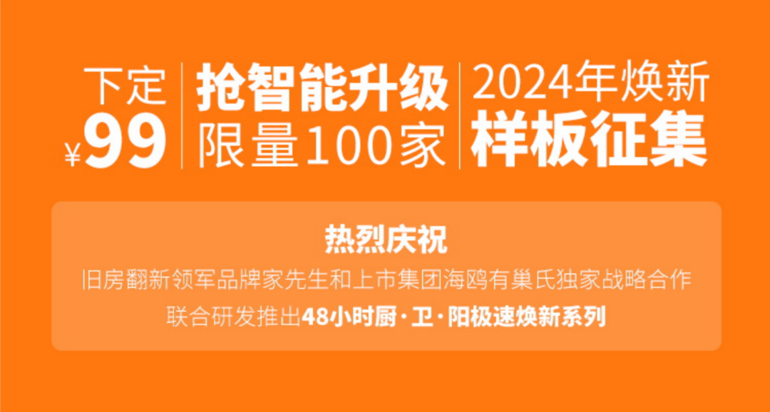 中國舊房翻新領軍品牌-家先生和上市集團海鷗住工-有巢氏獨家戰(zhàn)略合作聯(lián)合研發(fā)推出48小時廚衛(wèi)陽極速煥新系列。2024年煥新樣板征集,下定¥99搶智能升級(限量100家)!