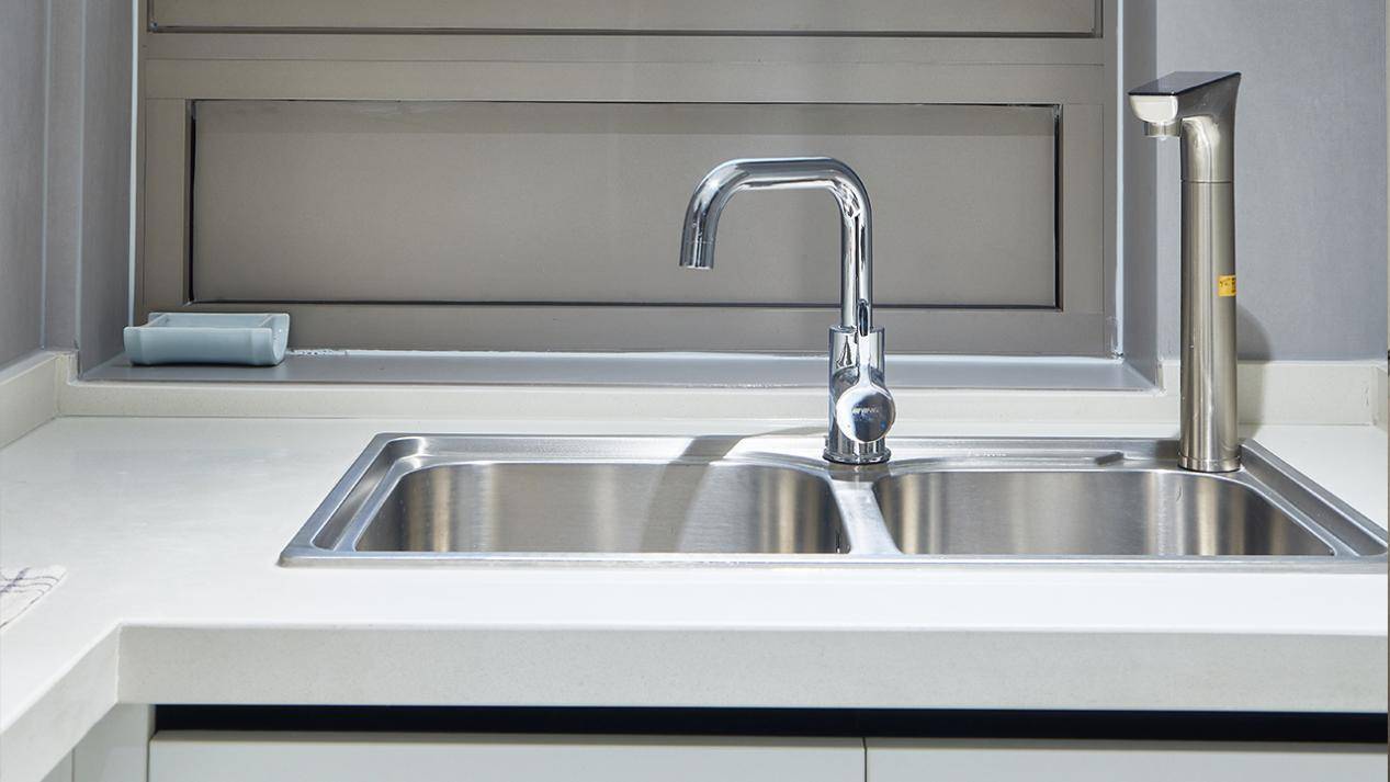 新房廚房寬敞明亮,設(shè)備齊全,搭配鷹衛(wèi)浴SUS304拉絲廚衛(wèi)雙盆KS-4011.2和92系列面盆龍頭EF-921011,暢享廚房樂趣。