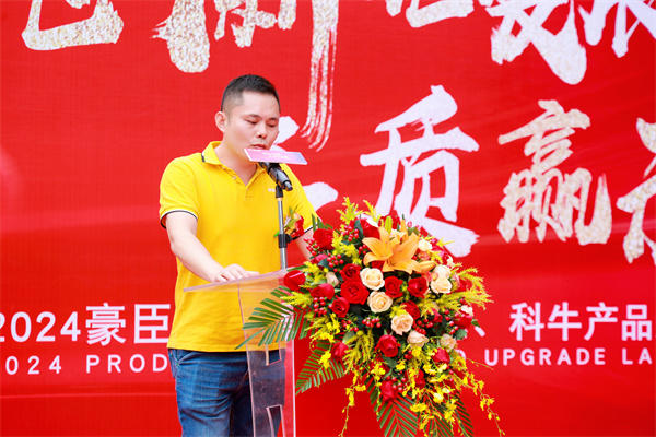 裕輝集團(tuán)·【豪臣、鴻景、寶詩龍、科?!繝I銷總經(jīng)理黃炯輝上臺致辭:黃總明確各品牌產(chǎn)品和營銷雙輪驅(qū)動戰(zhàn)略規(guī)劃,會加強(qiáng)注重產(chǎn)品創(chuàng)新并推進(jìn)渠道下沉。市場瞬息萬變,挑戰(zhàn)近在咫尺,面對激烈的市場競爭環(huán)境,豪臣、鴻景、寶詩龍、科牛四個品牌會立足長遠(yuǎn),全局統(tǒng)籌策劃,順應(yīng)消費(fèi)年輕化趨勢,積極調(diào)整品牌、產(chǎn)品、渠道、營銷等領(lǐng)域的戰(zhàn)略布局,加強(qiáng)線上引流與銷售,促進(jìn)線上線下融合,緊跟時代步伐,把握流量機(jī)遇,以研產(chǎn)銷一體化驅(qū)動發(fā)展,共筑品牌新高度,愿與全球合作伙伴們一起齊心協(xié)力,共創(chuàng)裕輝!
