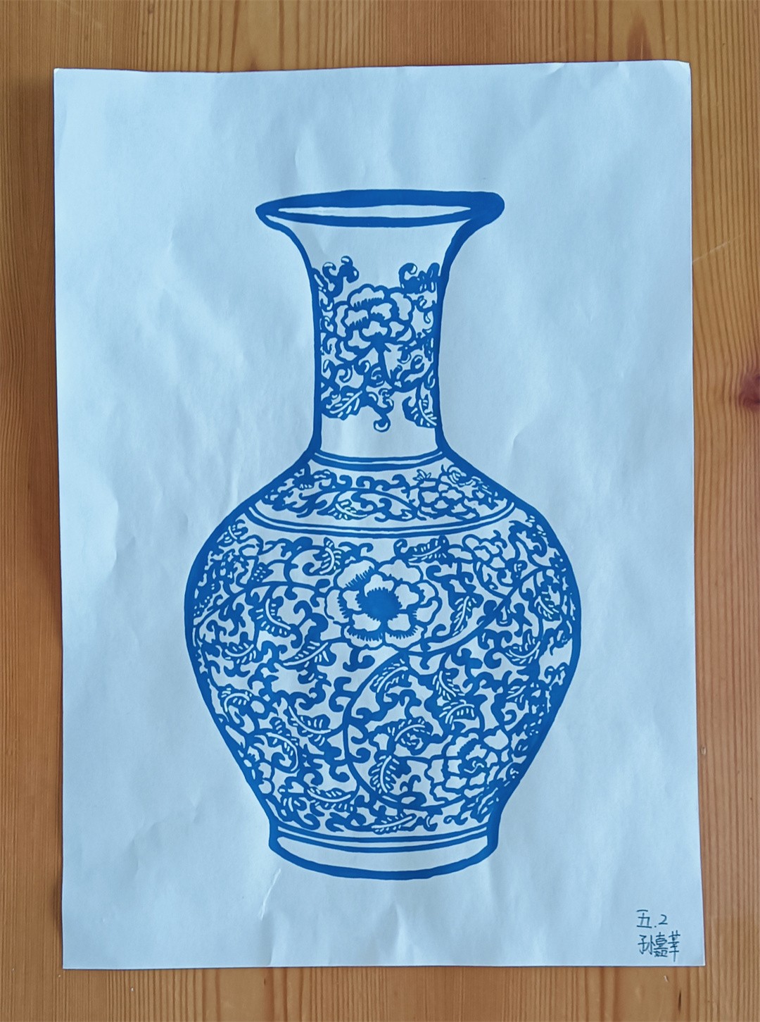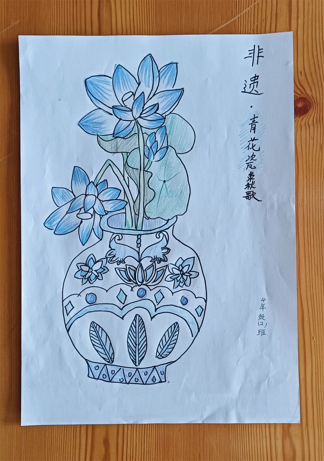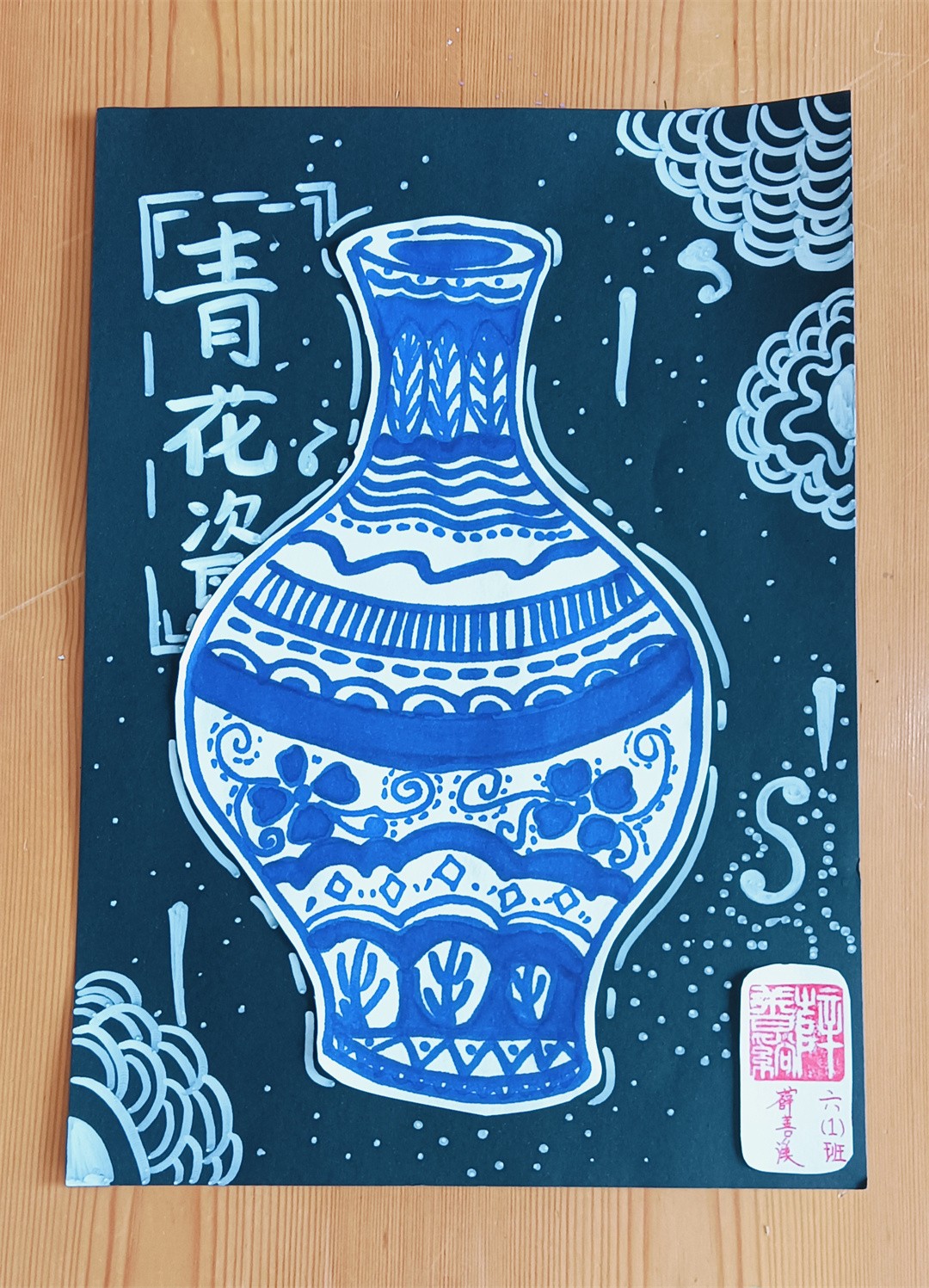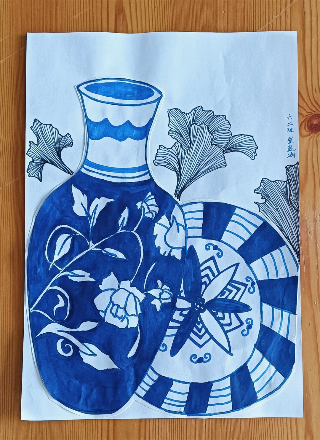 青花瓷線描,1、輪廓起稿,觀察青花瓷圖片資料,用鉛筆分出瓶口、瓶身、瓶底區(qū)域,注意線條方向,不是直線條。2、用鉛筆勾勒出花紋,注意用鉛筆時(shí),筆要輕。3、用藍(lán)色馬克筆勾勒出花紋,完成后要把鉛筆印擦掉。4、用藍(lán)色馬克筆加花紋、畫色塊,刻畫細(xì)節(jié)部分,使畫面更豐富。最后寫上班級(jí)、姓名。隨后,在陶藝?yán)蠋煹闹笇?dǎo)下,同學(xué)們拿起畫筆,巧妙構(gòu)圖,每一筆細(xì)致的勾勒,每一劃深情的描繪,同學(xué)們的設(shè)計(jì)作品,構(gòu)圖完整,造型可愛,線條流暢自如,展現(xiàn)了同學(xué)們獨(dú)特的藝術(shù)視角和豐富的想象力,每一幅作品,都是同學(xué)們對(duì)傳統(tǒng)文化的一個(gè)深刻詮釋與獨(dú)特表達(dá)。陶藝課不僅提高了同學(xué)們的動(dòng)手與藝術(shù)設(shè)計(jì)能力、審美能力和創(chuàng)造力,還增進(jìn)了同學(xué)們對(duì)青花瓷文化的理解與欣賞,從中了解青花瓷的特點(diǎn),領(lǐng)略青花瓷的清秀典雅,感受著青花瓷器的精美絕倫。助力同學(xué)們?cè)谒囆g(shù)的滋養(yǎng)中茁壯成長(zhǎng)。