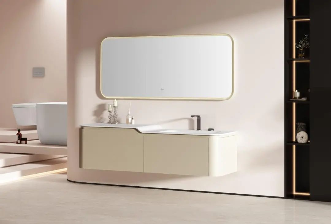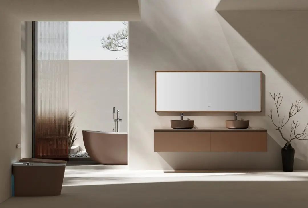在本次廣交會亮相的【木里定制浴室柜】,創(chuàng)新采用啞光膚感「公爵板」臺面,搭載行業(yè)領(lǐng)先的雙色無縫拼接技術(shù),實(shí)現(xiàn)臺盆內(nèi)外差異化配色美學(xué)突破。并經(jīng)國家質(zhì)檢院權(quán)威機(jī)構(gòu)檢測認(rèn)證榮膺【沸騰質(zhì)量金獎】,柜體不僅通過25kg重力沖擊測試與4萬次暴力開合極限挑戰(zhàn),依然毫無破損,穩(wěn)固如初,而且在防潮性能、環(huán)保性能、抗沖擊性能上等評測項(xiàng)中均交出亮眼答卷。