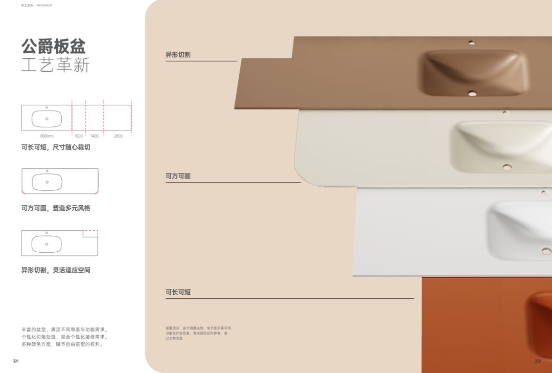 此外,帝王潔具多款「公爵板」系列產(chǎn)品均已上市:【奇境·定制浴室柜】展現(xiàn)了帝王成熟的色彩工藝,公爵板臺盆與多層實(shí)木柜體實(shí)現(xiàn)了質(zhì)感統(tǒng)一、色系統(tǒng)一,更提供了臺上盆、臺下盆多樣化選擇;【頤和·定制浴室柜】則通過公爵板實(shí)現(xiàn)了藝術(shù)雙盆一體化成型設(shè)計,給予了衛(wèi)浴空間更多美學(xué)想象;【和顏·定制浴室柜】通過公爵板打造了高低干濕分區(qū)臺面,以階梯式設(shè)計實(shí)現(xiàn)干濕分區(qū)與洗漱動線美學(xué)平衡。